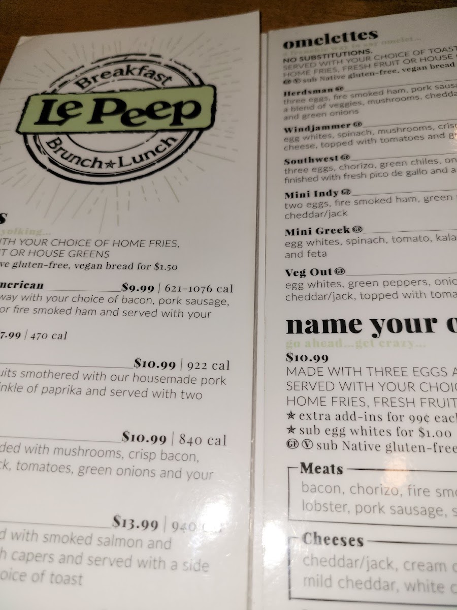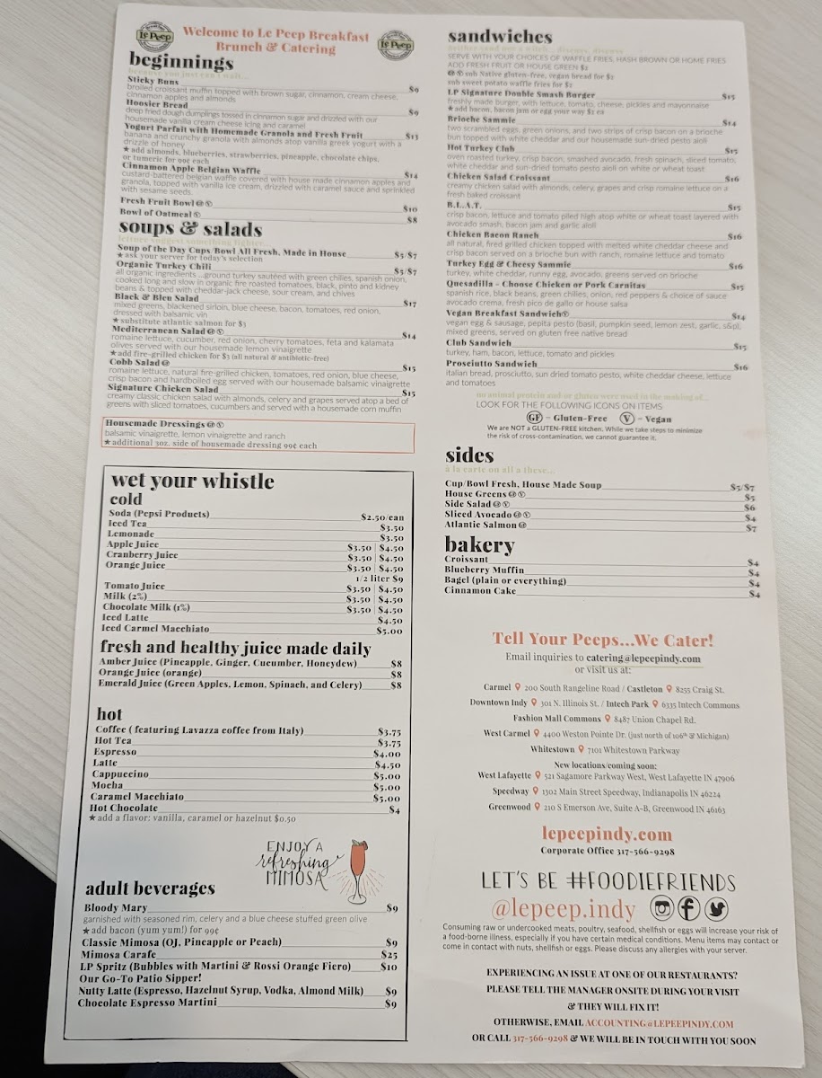 Welcome to Le Peep Intech Commons, a delightful breakfast and lunch haven located in Indianapolis, IN. This charming restaurant is celebrated for its extensive menu catering to every palate. Whether you’re a fan of classic breakfast options or adventurous combinations, you'll find something to love here.